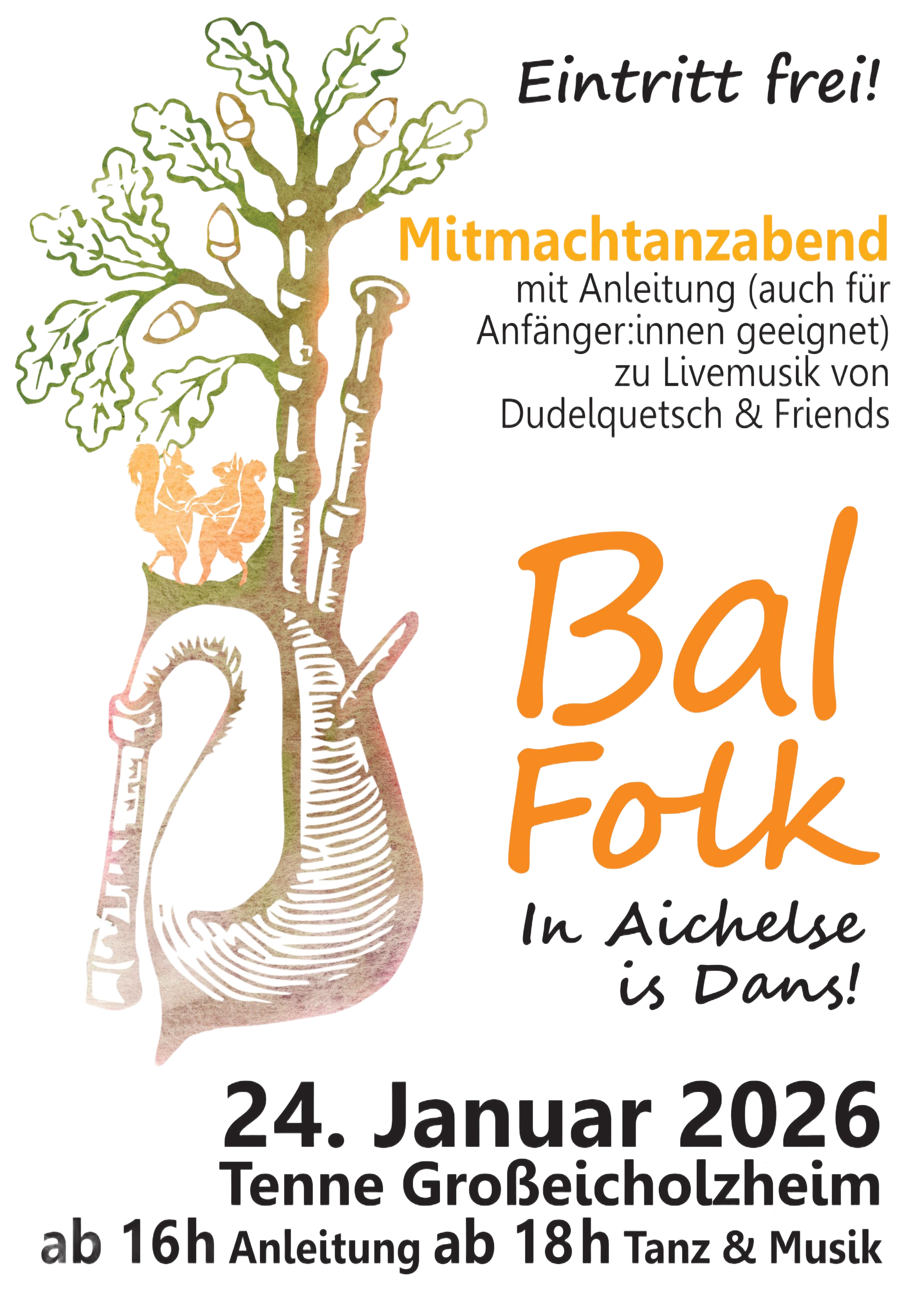 Am 24. Januar 2026 ab 18 Uhr findet in der Tenne Großeicholzheim der 1. Bal Folk von und mit Dudelquetsch statt!