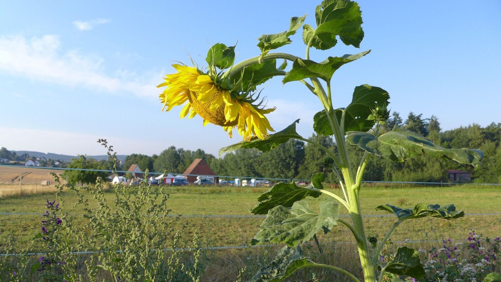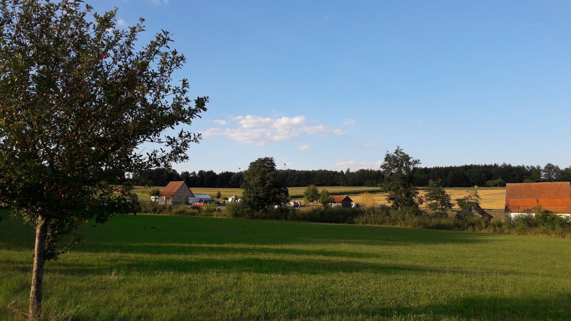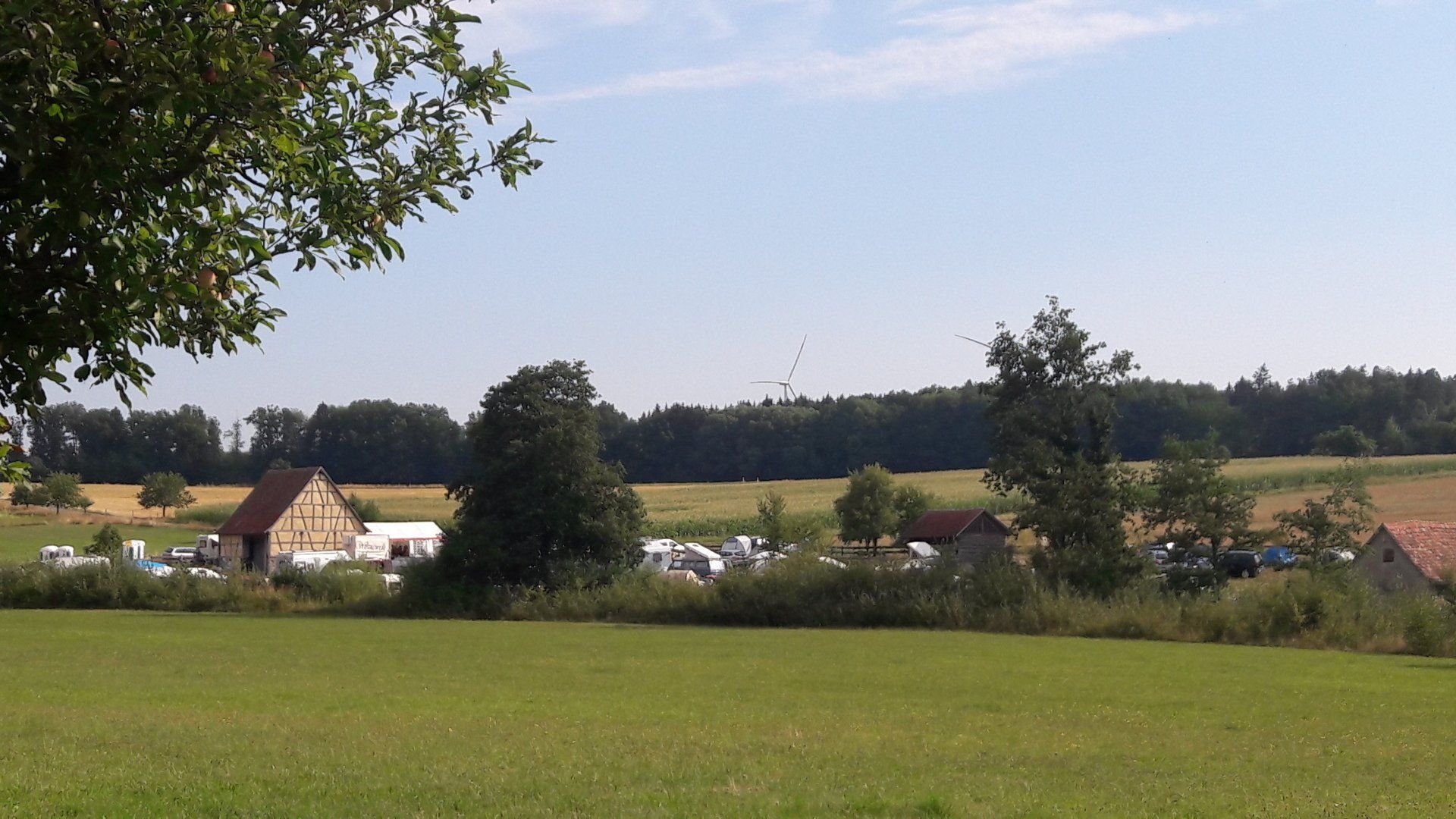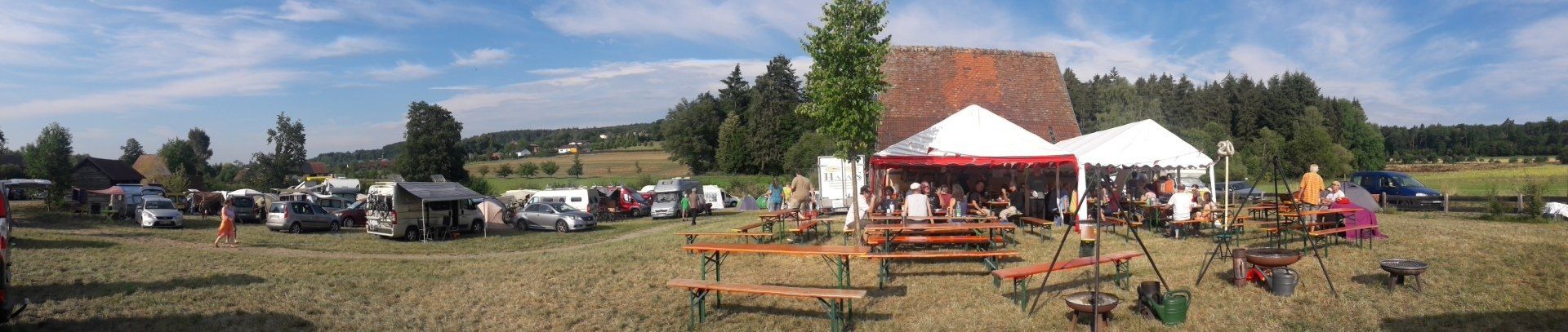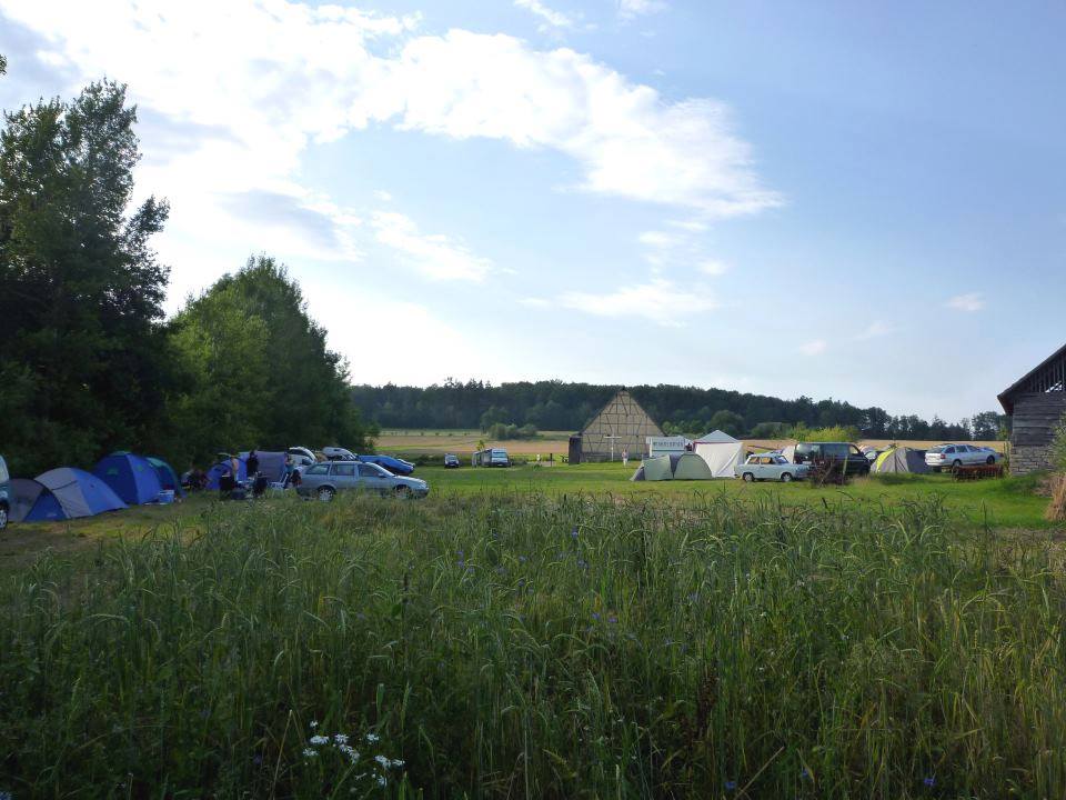 On the camping green, there is one historical building, the Honey Barn. Next to it, there’s the big Party Tent: there are tables and benches to sit on, drinks like water, lemonade and beer in a big refrigerator which you can take and pay for later, shared food (so feel free to bring cake or whatever, place it on the counter table next to the others and help yourself to it!) and coffee and hot water for tea. Usually, there is always someone hanging around the Party Tent making music, eating or talking, so come by and say hello. There, you will also find someone to help you to get electricity to your car or tent should you need it, just remember to bring an extension cord. If you only need to charge your mobile of any other device, there are also shared power strips somewhere in the Party Tent where you can just plug your charger in and call it a day.